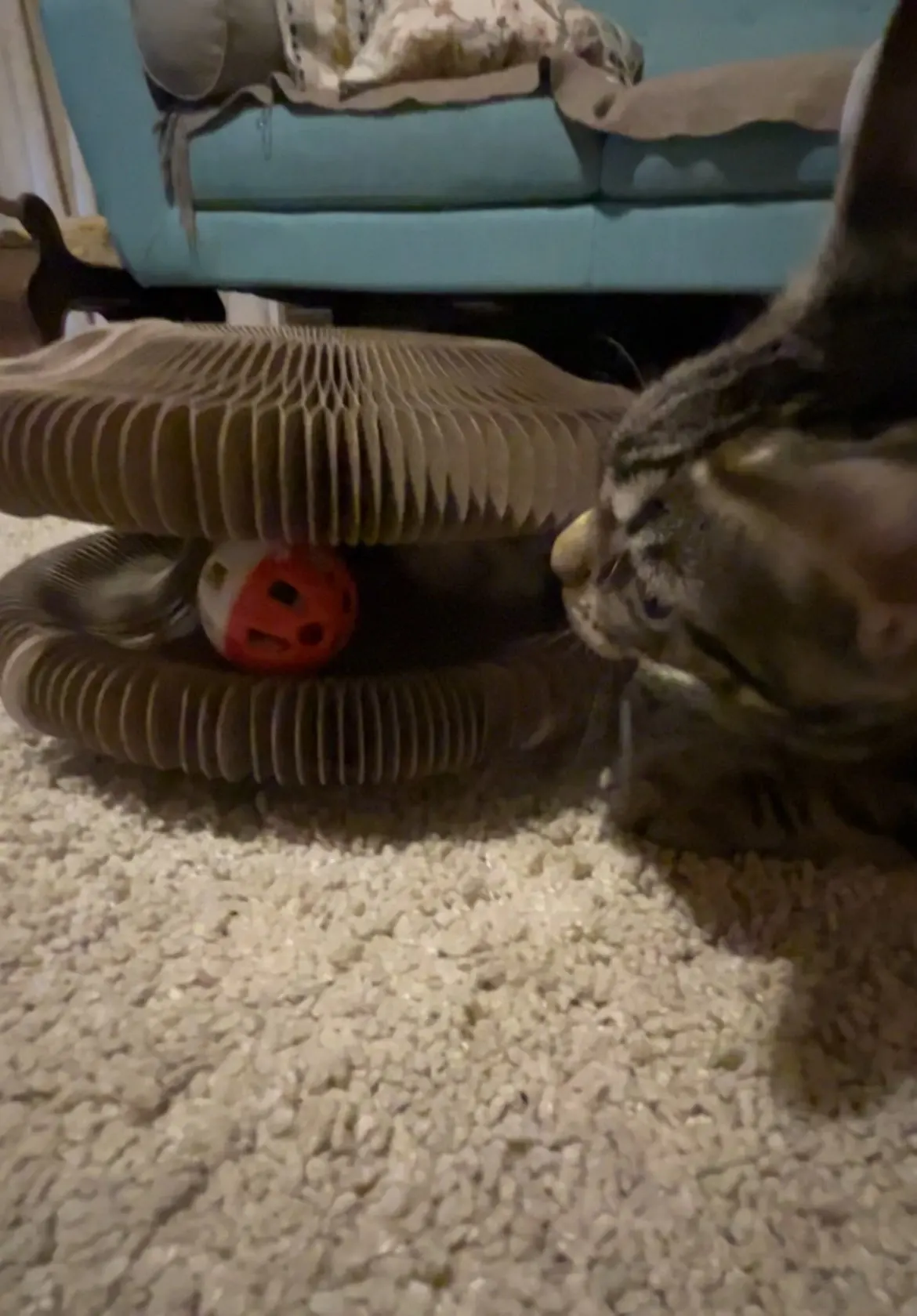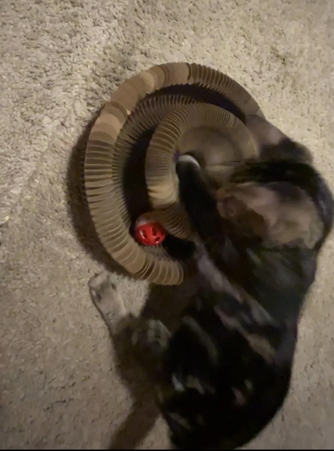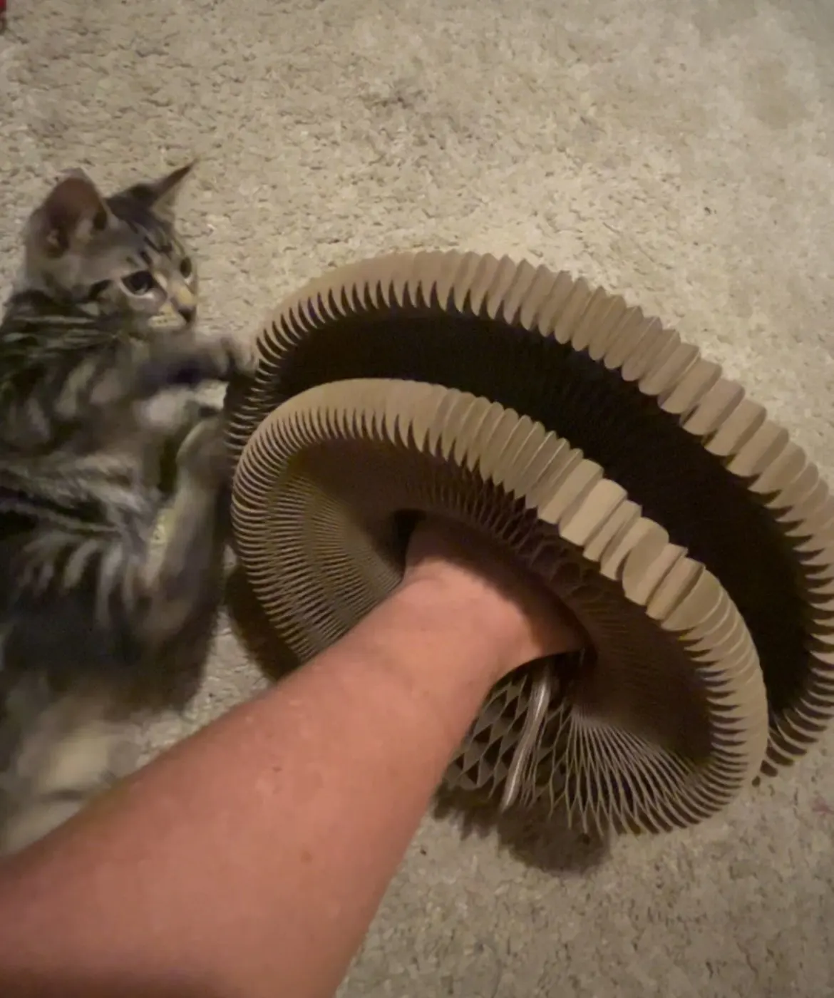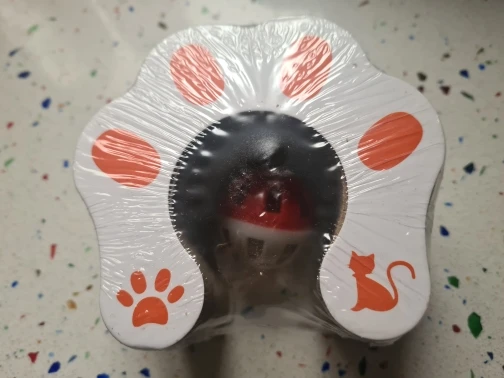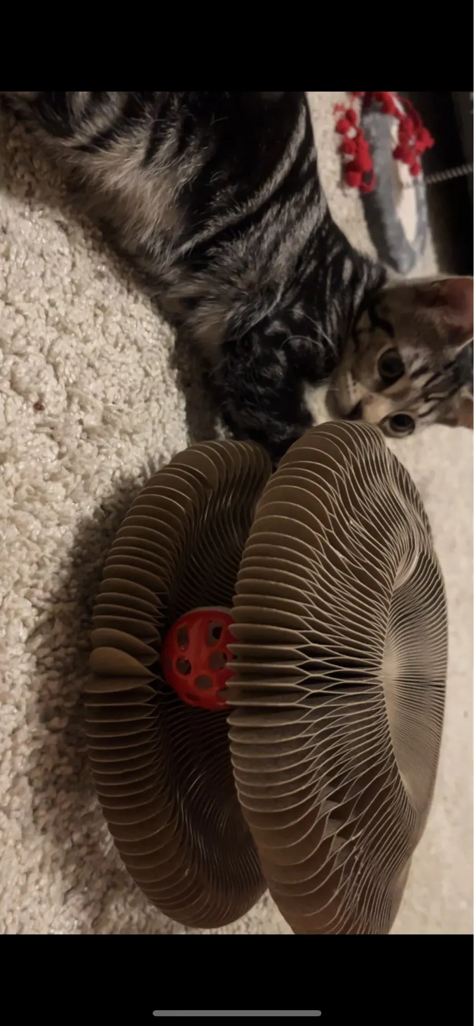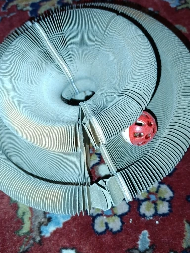 It is perfect. My kitten loves it. It starts as a small thing and then you pull it apart and can you stick the ends together with the magnets and then your cat can play with it and then when you’re done you can take the magnets apart and pack it down again so it’s small again. Love it. She’s going to destroy it but it’s worth it.